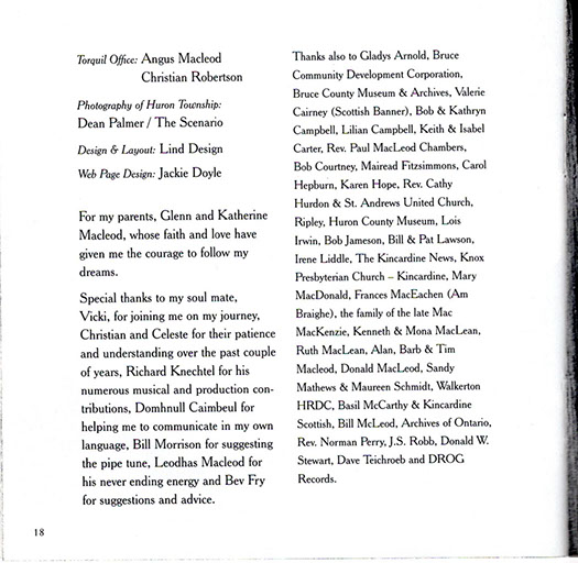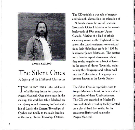 The Silent Ones is especially close to Angus Macleod's heart as he is a direct descendant of these Gaelic pioneers. The CD was recorded at Macleod's own multi track recording facility located on a plot of land first settled by his great grandfather and namesake, Angus Macleod. Composing and recording the CD within the picturesque confines of Huron Township, the exact location of most of the events described in the Silent Ones, was a constant source of inspiration for Angus.