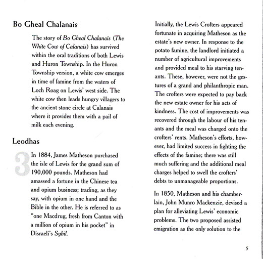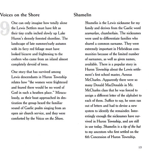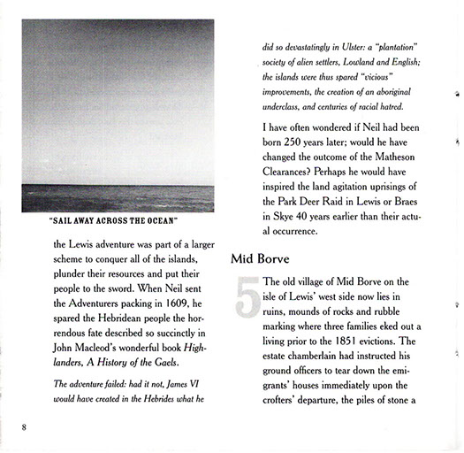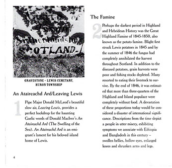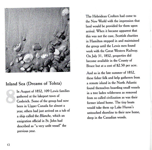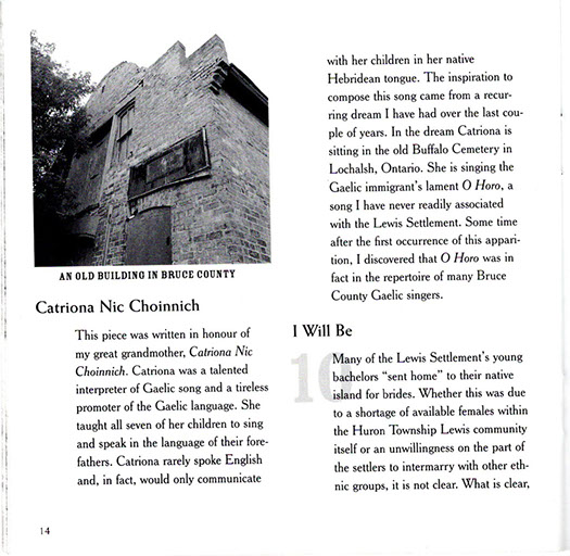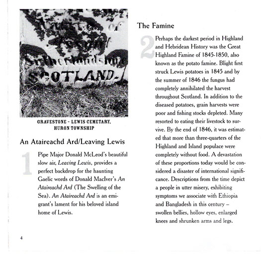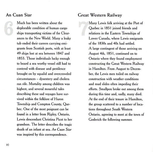 The CD unfolds a true tale of tragedy and triumph chronicling the migration of 109 families from the Island of Lewis in Scotland's Outer Hebrides to the remote backwood's of nineteenth century Upper Canada. Victims of a kind of nineteenth century ethnic cleansing known as the Highland Clearances, the Lewis emigrants were evicted from their Hebridean crofts in 1851 by landowner James Matheson. The crofters were then transported overseas where they settled together in a block of farms in Bruce County, Ontario; maintaining their language and culture well into the twentieth century. The group has become known as the Lewis Settlers.