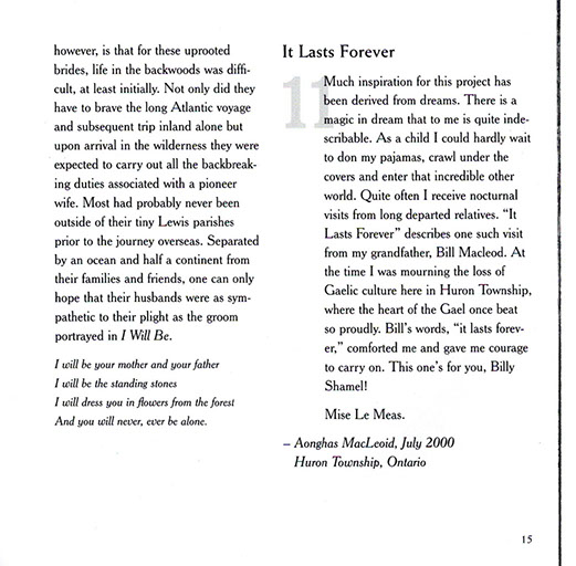 "I remember taking a break from recording one evening, stepping outside to catch a breath of night air. I had left the tape machine running and one of the Gaelic sections was drifting out the studio window; the ancient words of the text bouncing off the trees and floating across the fields down to the tiny stream at the back of our property. In a moment of enlightenment, I realized that these old words, now foreign to the area's residents, had not been spoken here since my great grandparents time. As the words echoed carelessly around my great grandfathers former homestead, I swear I could feel his spirit in the rustling of the trees and the gentle motion of the summer breeze."