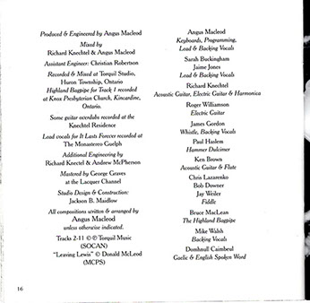 The CD was recorded between February 1998 and November 1999 with Macleod putting himself on a rigorous 14 hour a day, 7 day a week schedule. The Silent Ones meticulously combines state of the art keyboard and computer technology with traditional instruments like Highland Bagpipe, fiddle, whistle, mandolin and hammer dulcimer. Lead vocals are handled by 17 year old Kincardine native Sarah Buckingham. "Sarah's involvement in the CD came quite by accident", says Macleod. "Prior to recording the disc I put together a short list of vocalists who I had either worked with musically or hired during my 5 year stint as a Folk Festival Artistic Director. I was about to start auditioning when I heard Sarah sing at a concert I was recording for the town of Kincardine's Sesquicentennial. The minute Sarah started to sing a hush fell over the audience and the auditorium became completely still. She has that kind of voice - so clean and pure, its startling."